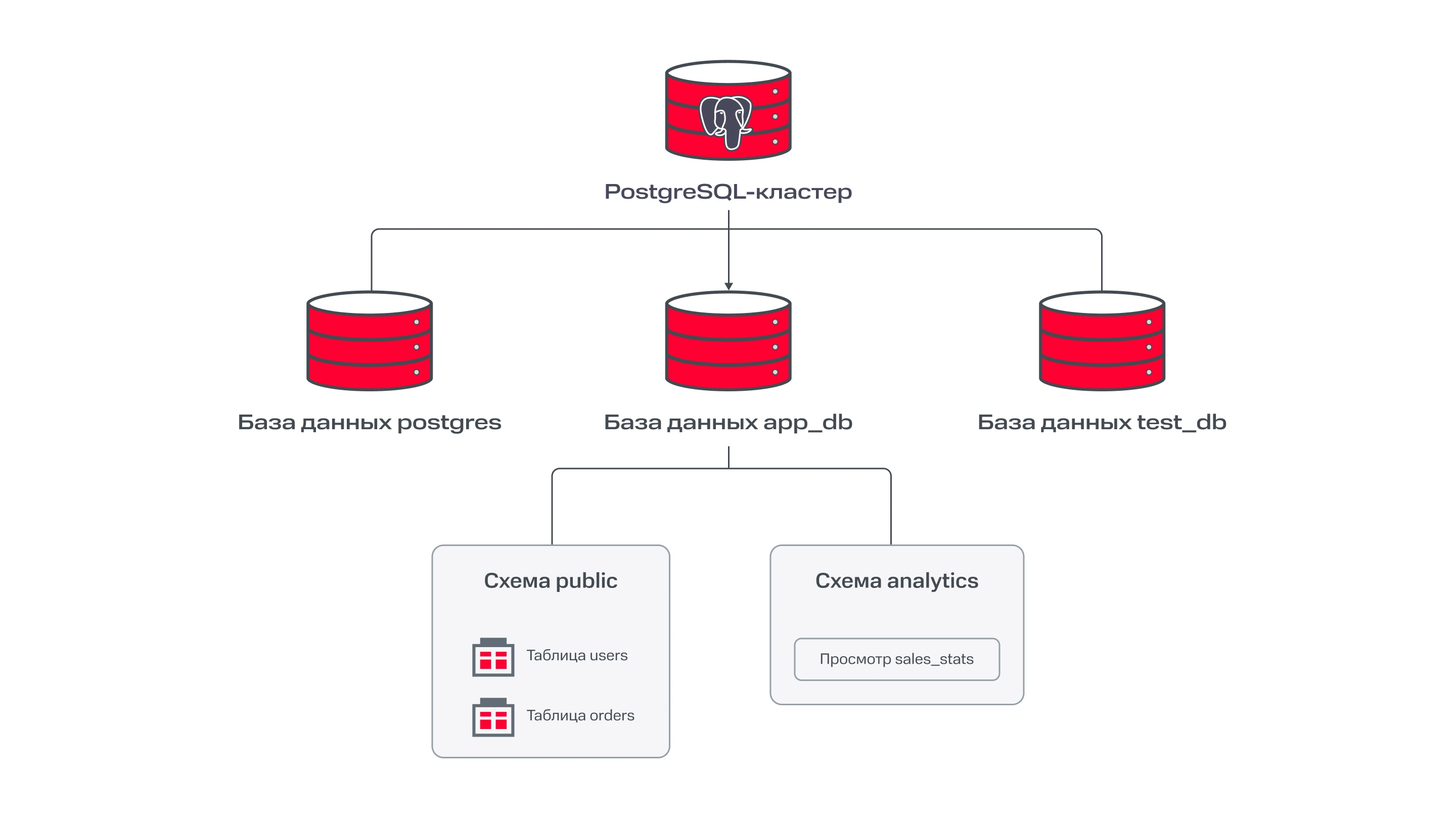 Такое логическое разделение позволяет изолировать данные разных приложений в рамках одного сервера или организовать многопользовательскую работу, например, когда разные отделы компании используют отдельные базы в одном кластере.