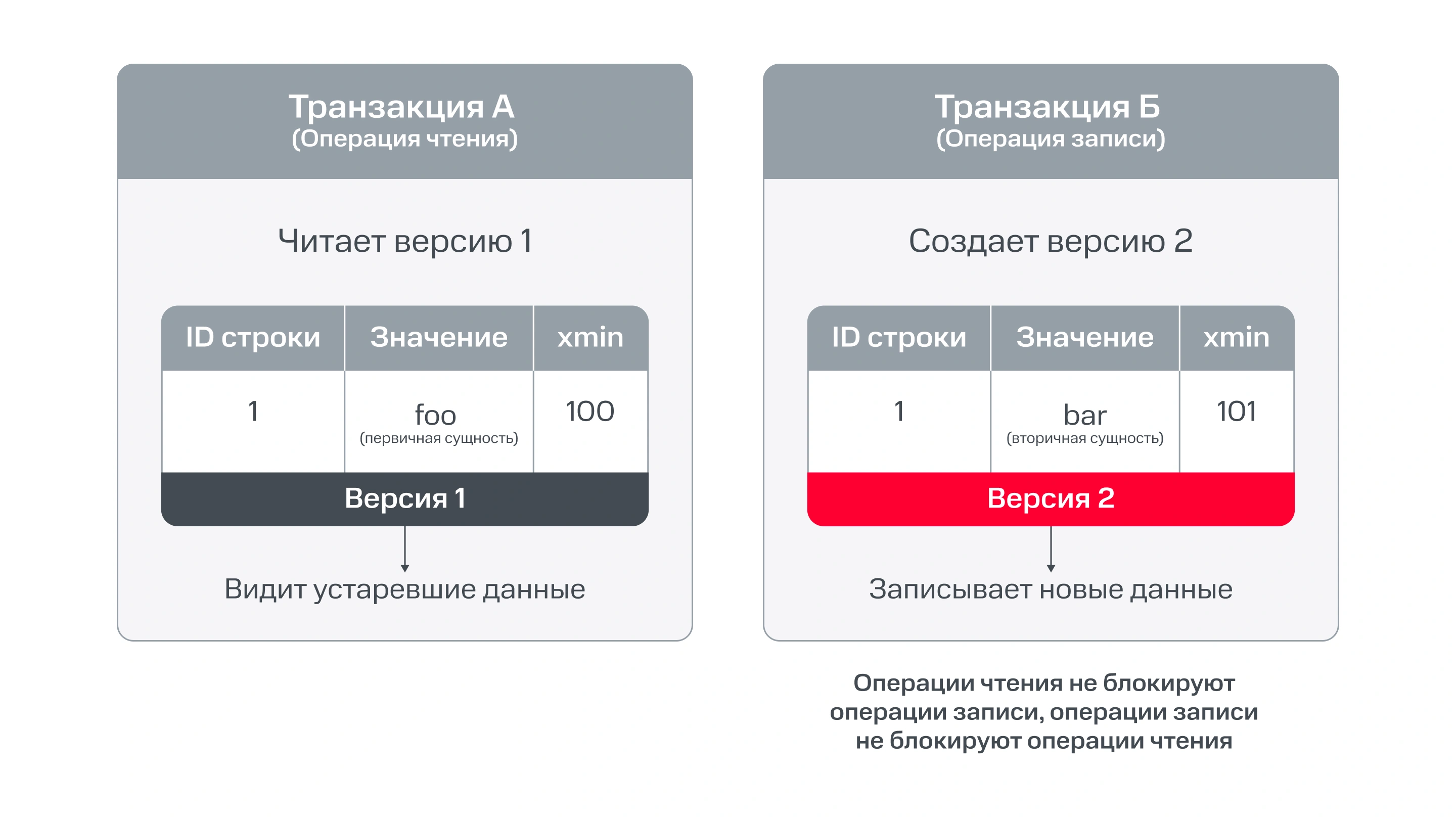 Ключевой механизм, отличающий PostgreSQL, — многоверсионное хранение данных (MVCC). Каждая транзакция видит свою версию базы данных во времени.