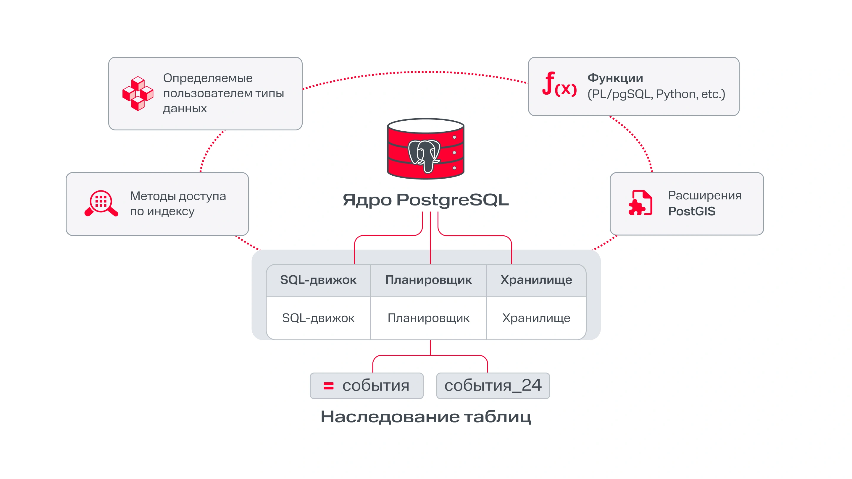 PostgreSQL обладает развитым механизмом расширений, который позволяет подключать дополнительную функциональность без доработки ядра.