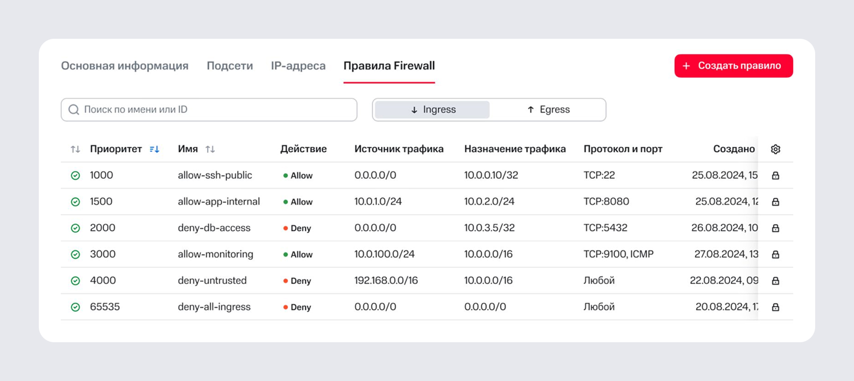Встроенный файрвол позволяет настроить правила для внутреннего и внешнего трафика. Например, создать правила для определённых протоколов и портов, а также выставить приоритеты для выполнения правил