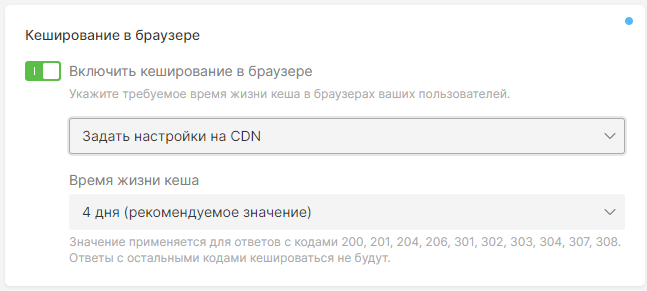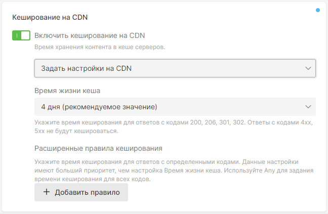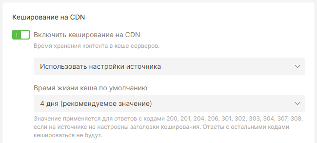 Опция «Кеширование на CDN» задаёт время хранения контента в кэше CDN-серверов. У неё есть два варианта работы: