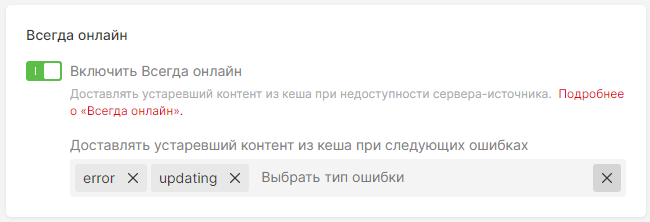 Опция позволяет отдавать последний кэшированный контент при недоступности сервера-источника при следующих ошибках: