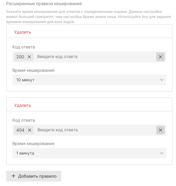 - чтобы задать время хранения кэша для запросов с другими кодами ответа или, чтобы переопределить некоторые из кодов параметра «Время жизни кеша»