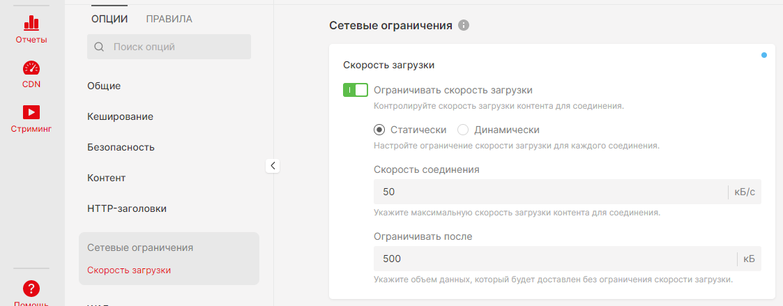 Ограничение скорости загрузки - опция, позволяющая ограничивать скорость отдачи контента конечным пользователям.