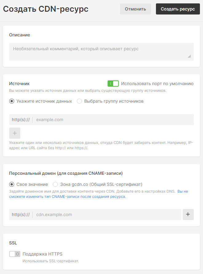 Если ранее была выбрана опция Свое значение, возможно добавить собственный SSL-сертификат для доставки контента через CDN. Чтобы это сделать, включите опцию Поддержка HTTPS.
