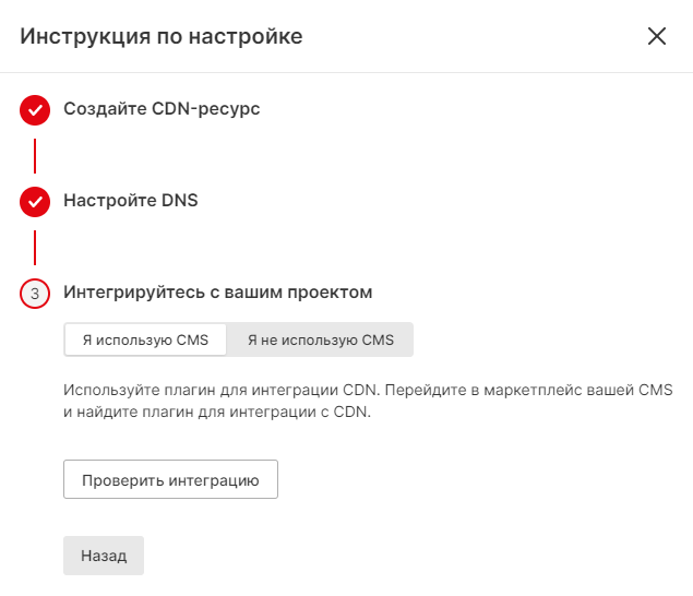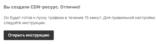 После того как вы создадите ресурс, появится оповещение Вы создали CDN-ресурс. Отлично! - нажмите на кнопку Открыть инструкцию.