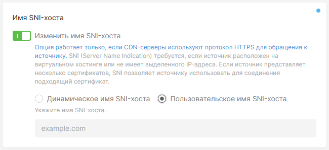 После создания ресурса опция будет автоматически активирована со значением по умолчанию «Динамическое имя SNI-хоста».