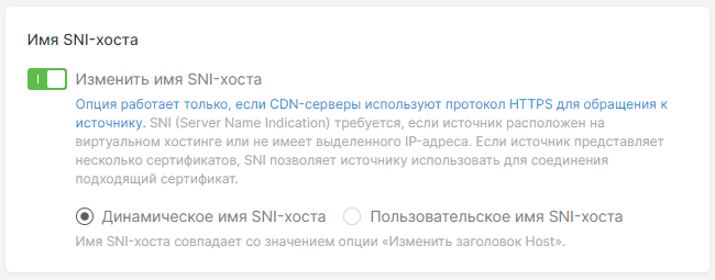 Опция Изменить имя SNI-хоста позволяет задать имя хоста, передающееся в SNI-запросах от CDN-серверов к серверу-источнику по протоколу HTTPS.