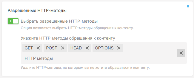 Возможно задать разрешенные HTTP-методы запросов к контенту в CDN. По умолчанию разрешены и доступны методы GET, HEAD, POST, PUT, PATCH, DELETE, OPTIONS.