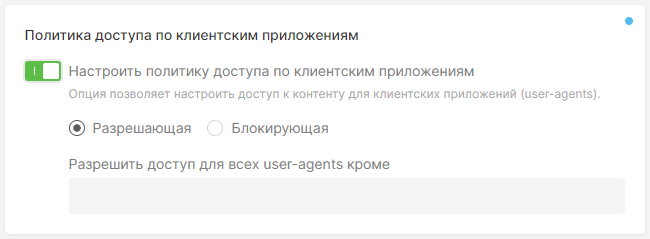 По умолчанию доступ к ресурсу разрешен всем клиентским приложениям. Возможно задать разрешающую или блокирующую политику.