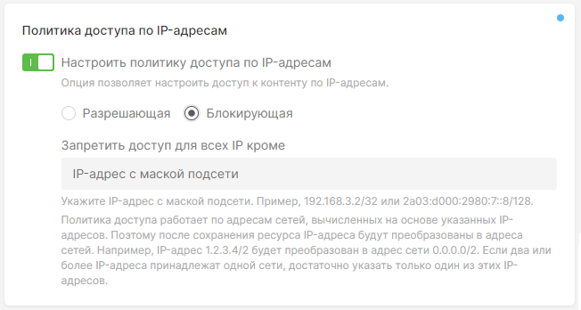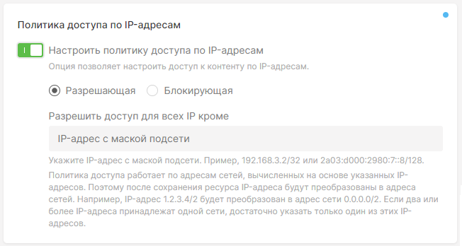 По умолчанию никакие ограничения доступа по IP к ресурсу не применяются. Возможно задать разрешающую или блокирующую политику.