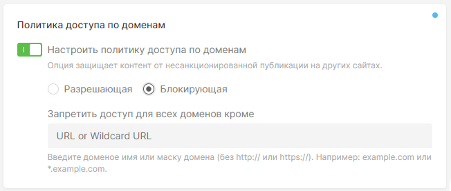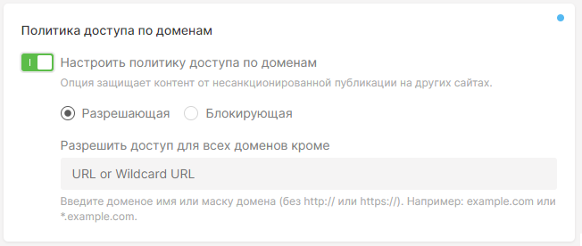 По умолчанию никакие ограничения доступа по доменам к ресурсу не применяются. Возможно задать разрешающую или блокирующую политику.