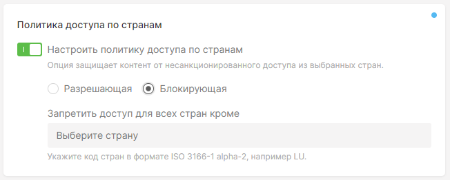 По умолчанию никакие ограничения доступа по странам к ресурсу не применяются. Возможно выбрать разрешающую или блокирующую политику.