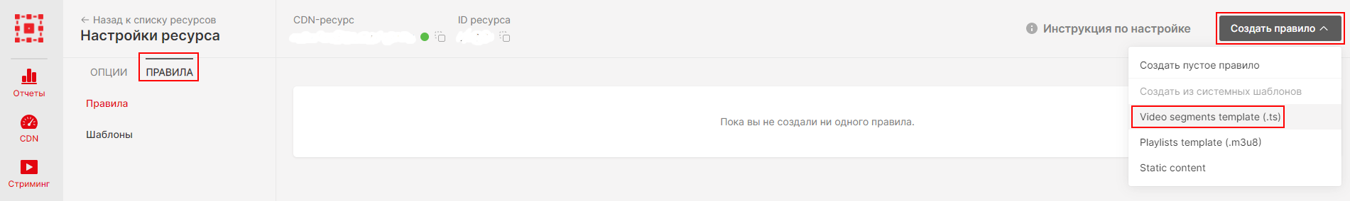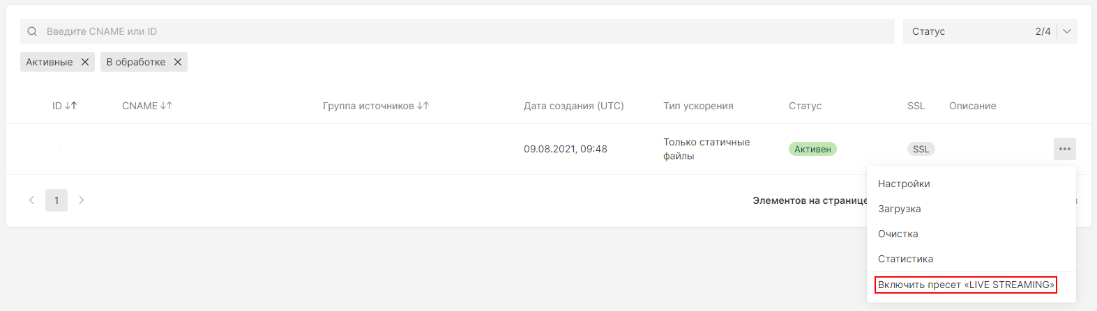 Чтобы файлы Live-трансляции кэшировались не на жестких дисках, а в оперативной памяти серверов, что позволяет ускорить передачу файлов через CDN, необходимо включить пресет «LIVE STREAMING» на используемом для трансляции ресурсе: