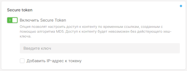 Чтобы защитить контент от нежелательных загрузок и настроить безопасный просмотр по временным ссылкам, воспользуйтесь опцией Secure Token в настройках CDN-ресурса.