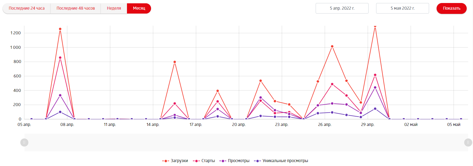 Просмотры — количество пользователей, посмотревших хотя бы 5 секунд видео/трансляции.