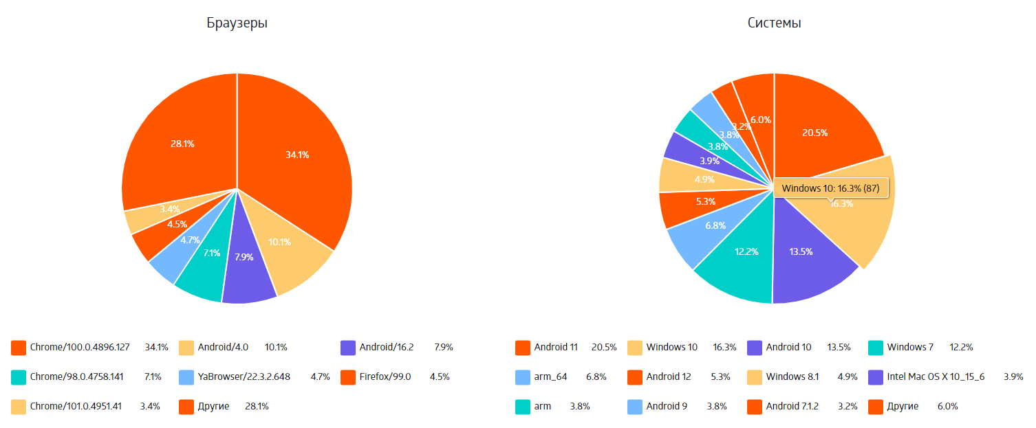 Браузеры и операционные системы, с которых запрашивались видео/прямая трансляция. Процент рассчитывается от общего количества просмотров (от 5 секунд и более) за выбранный промежуток времени.