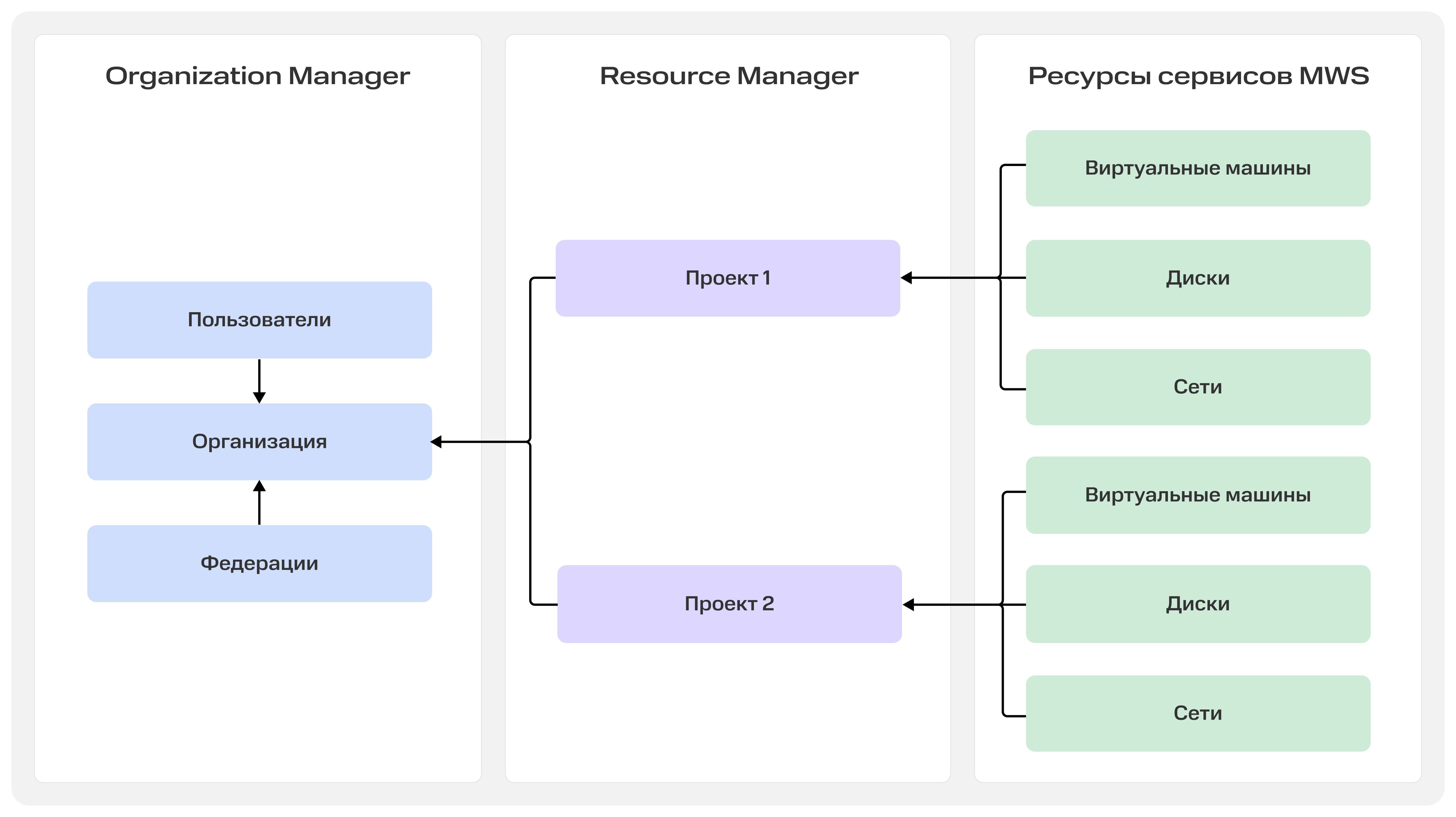 Ресурсная модель MWS Cloud организована в виде иерархии Организация → Проект → Ресурс: