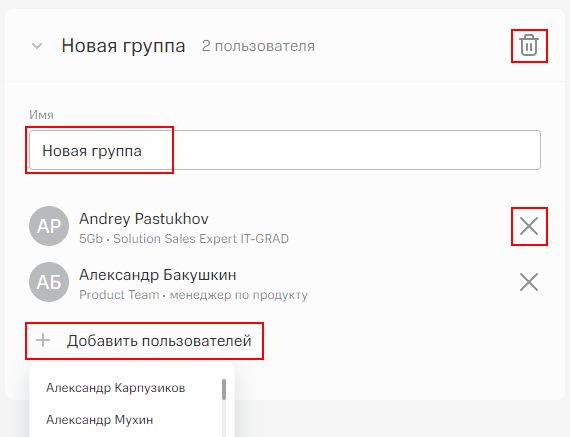 Существующую группу возможно изменить: переименовать, удалить, добавить или удалить пользователей.