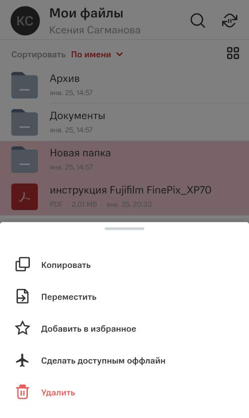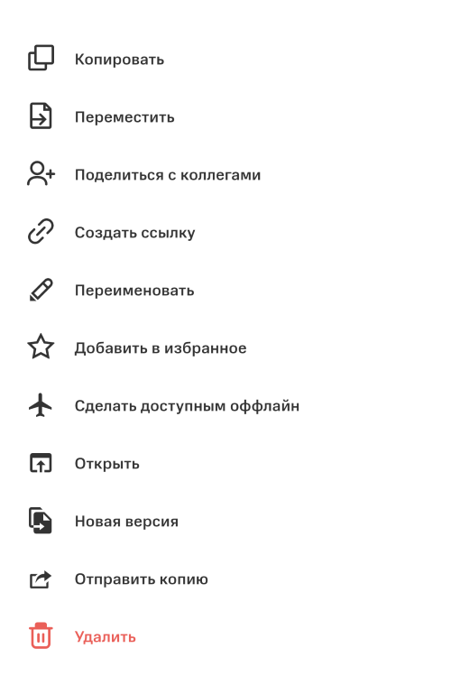 Таким образом возможно копировать, переместить, добавить в избранное, сделать доступными офлайн или удалить.