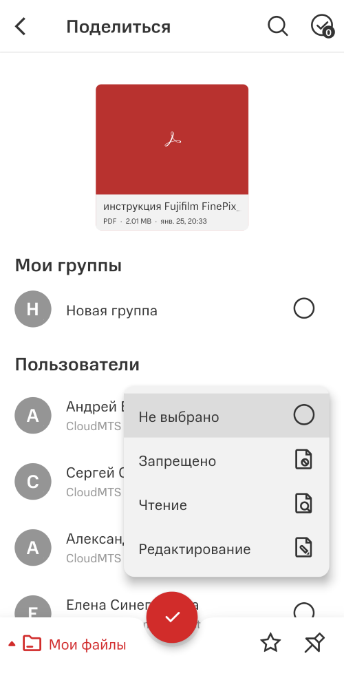 Приложение Диск CloudMTS позволяет полноценно управлять объектами файлового хранилища: добавлять новые файлы, создавать папки, удалять, переименовывать, предоставлять к ним доступ, отправлять копию, создавать новые версии.