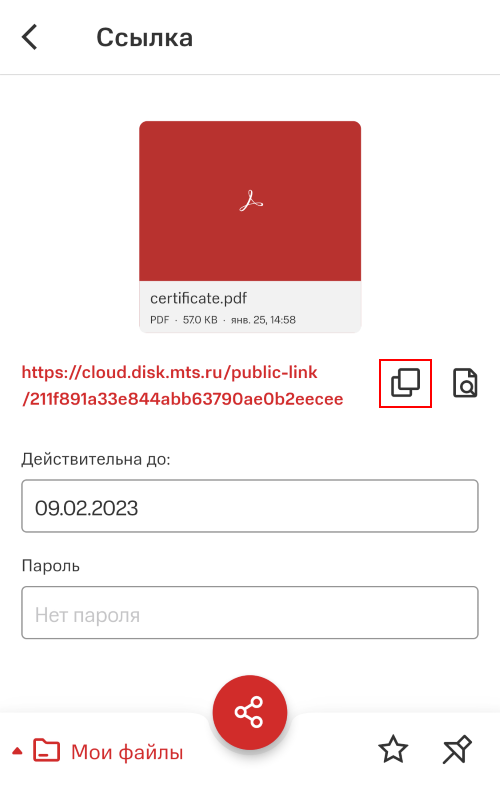 Созданную ссылку возможно скопировать. Чтобы это сделать, нажмите на соответствующую кнопку.