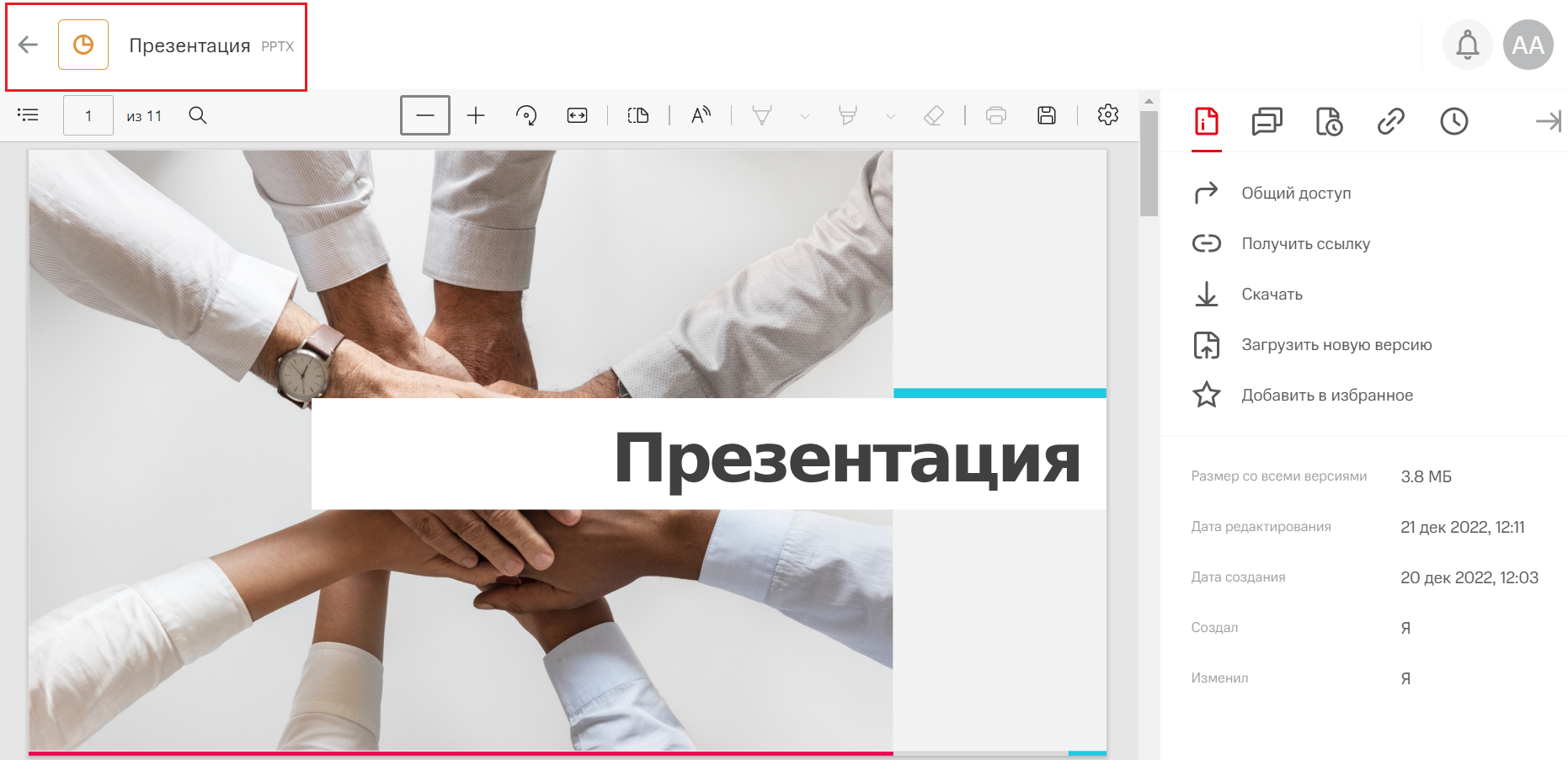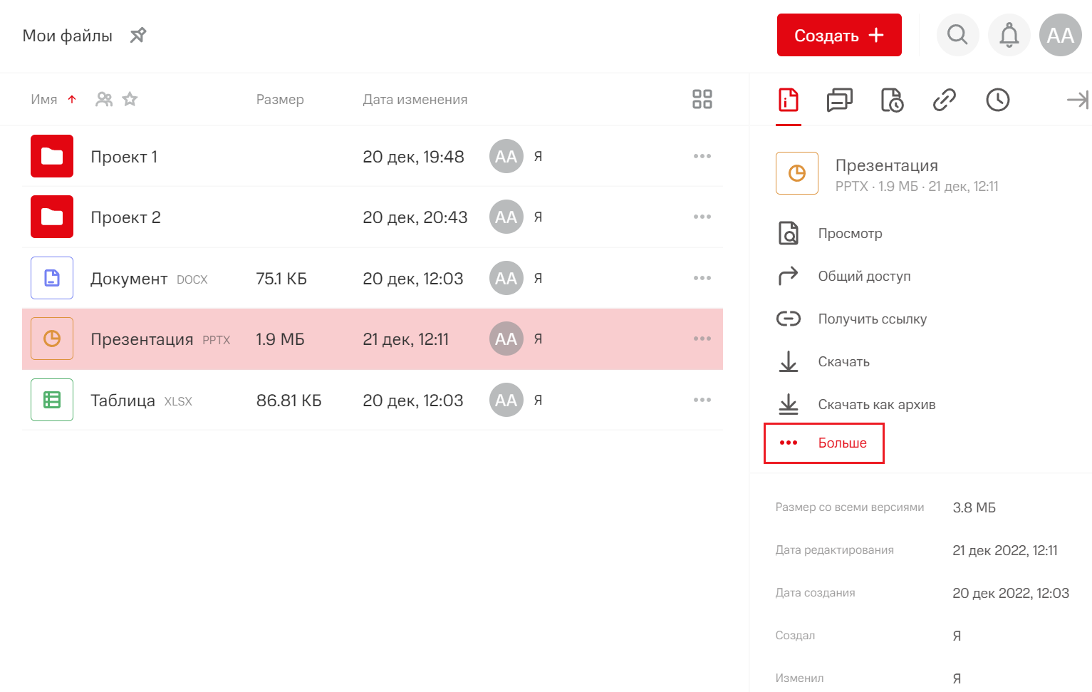 Ниже панели управления будет отображена информация о выбранном объекте: размер, даты редактирования и создания, авторы создания и изменений.