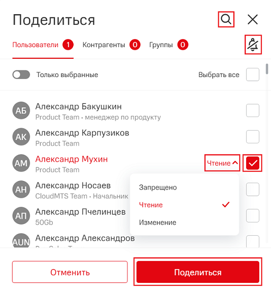 - В строке каждого пользователя в выпадающем списке выберите для него права доступа: Чтение, Изменение, Запрещено.