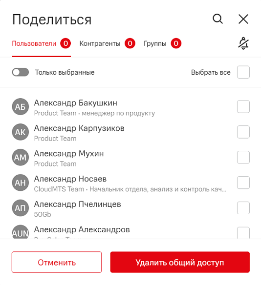 Чтобы выбрать всех пользователей из списка, включите опцию Выбрать все, чтобы увидеть только выбранных пользователей — опцию Только выбранные.