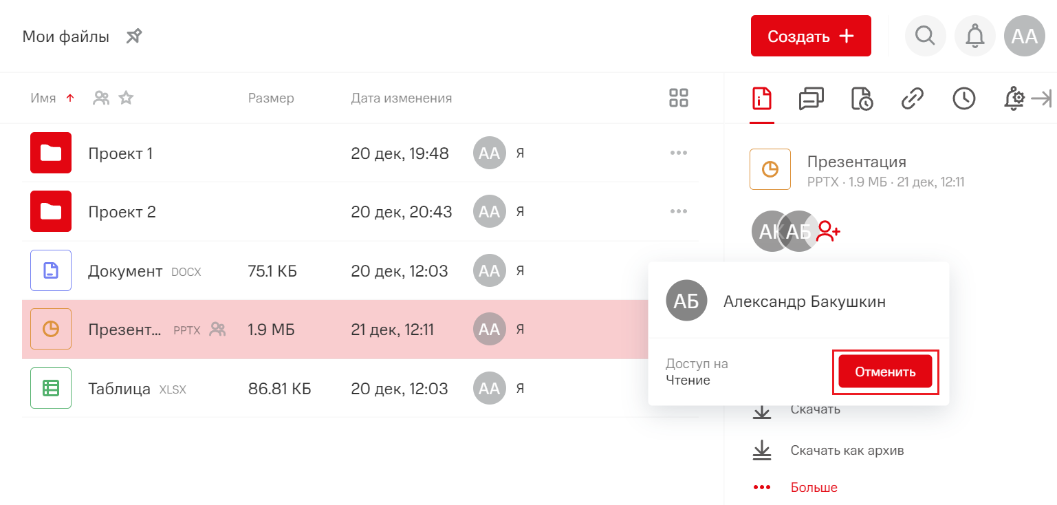 В поле Доступ на выберите права доступа: просмотр, чтение (просмотр с возможностью скачать), изменение.