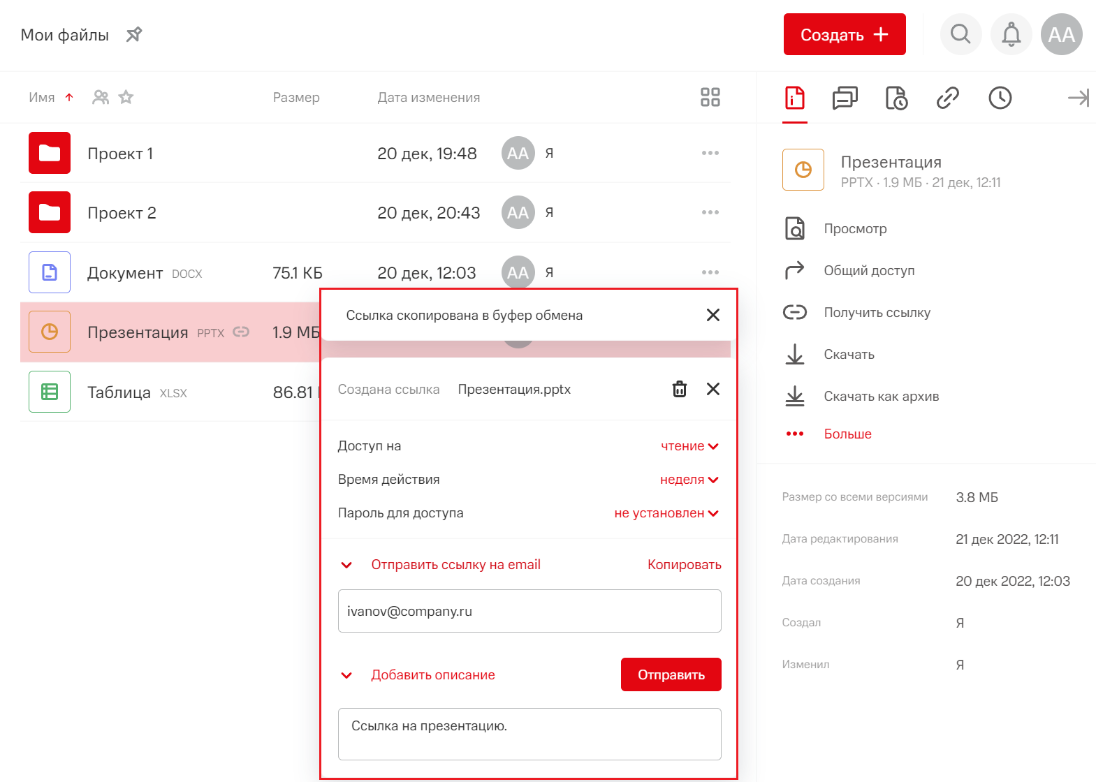 Ссылка будет автоматически создана с настройками доступа по умолчанию и скопирована в буфер обмена.