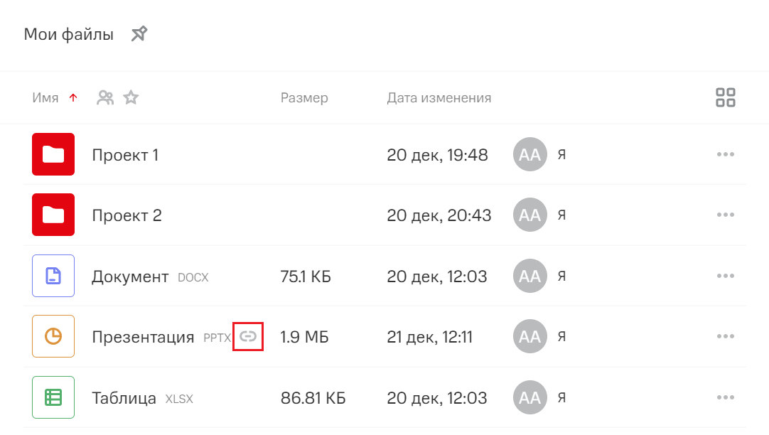 Объект с действующей ссылкой будет отмечен в файловом хранилище соответствующим символом.
