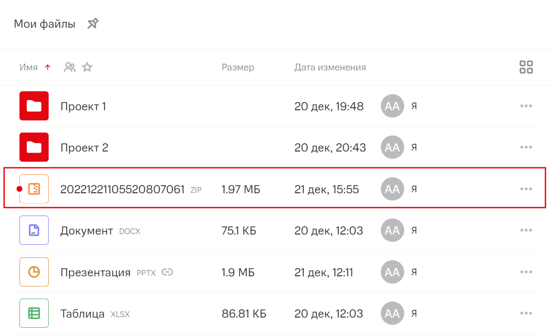 При выборе данной операции архив с объектом будет создан автоматически и отобразится в файловом хранилище под другим названием, состоящим из цифр.
