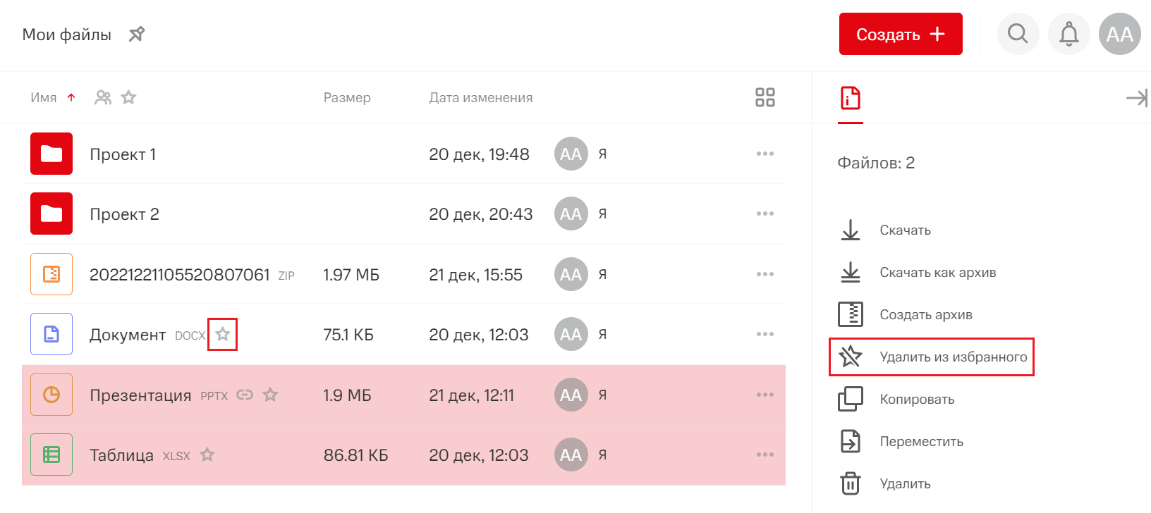 Для добавления в избранное нескольких объектов файлового хранилища одновременно, выберите необходимые объекты с использованием клавиш Shift или Ctrl.