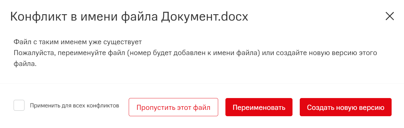 Если конфликт в имени возник сразу для нескольких файлов, можно применить один способ решения для всех этих файлов, включив опцию Применить для всех конфликтов.
