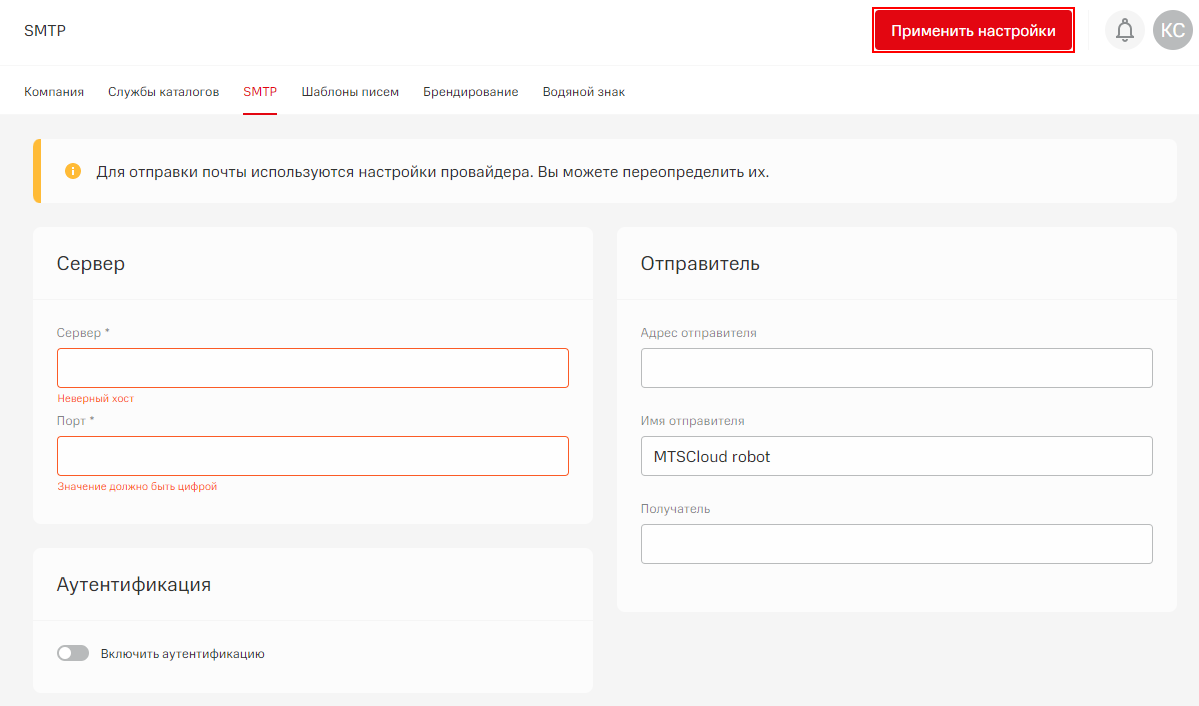 Данный раздел необходим для настройки почтовой службы сервиса.