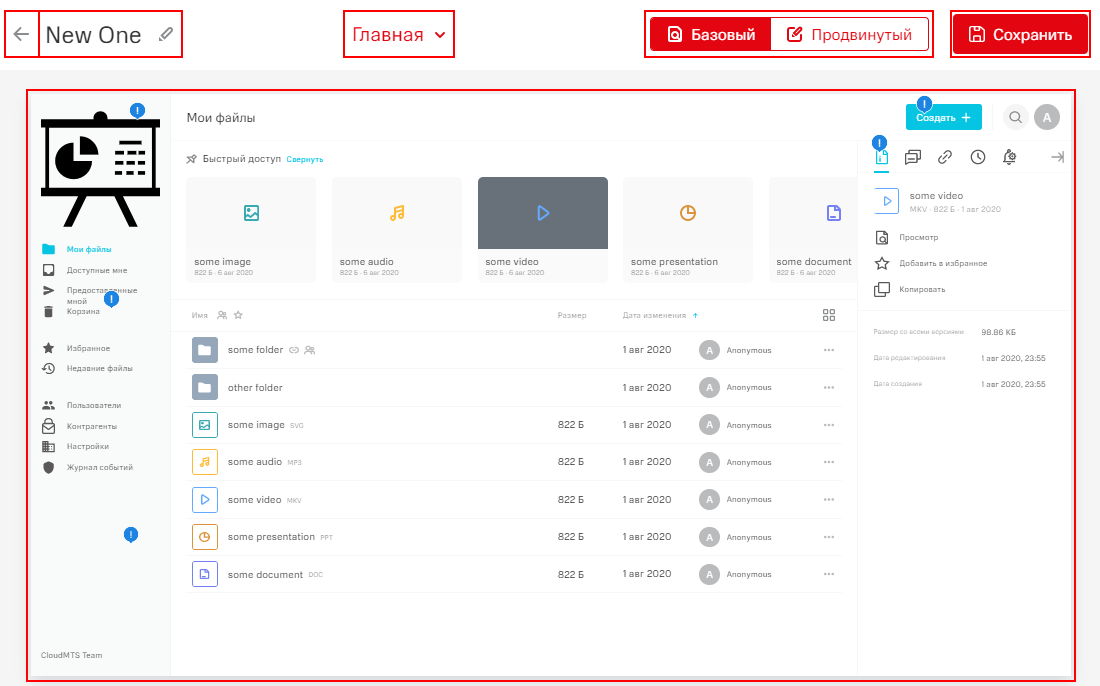 Настройки, доступные в базовом режиме редактирования: