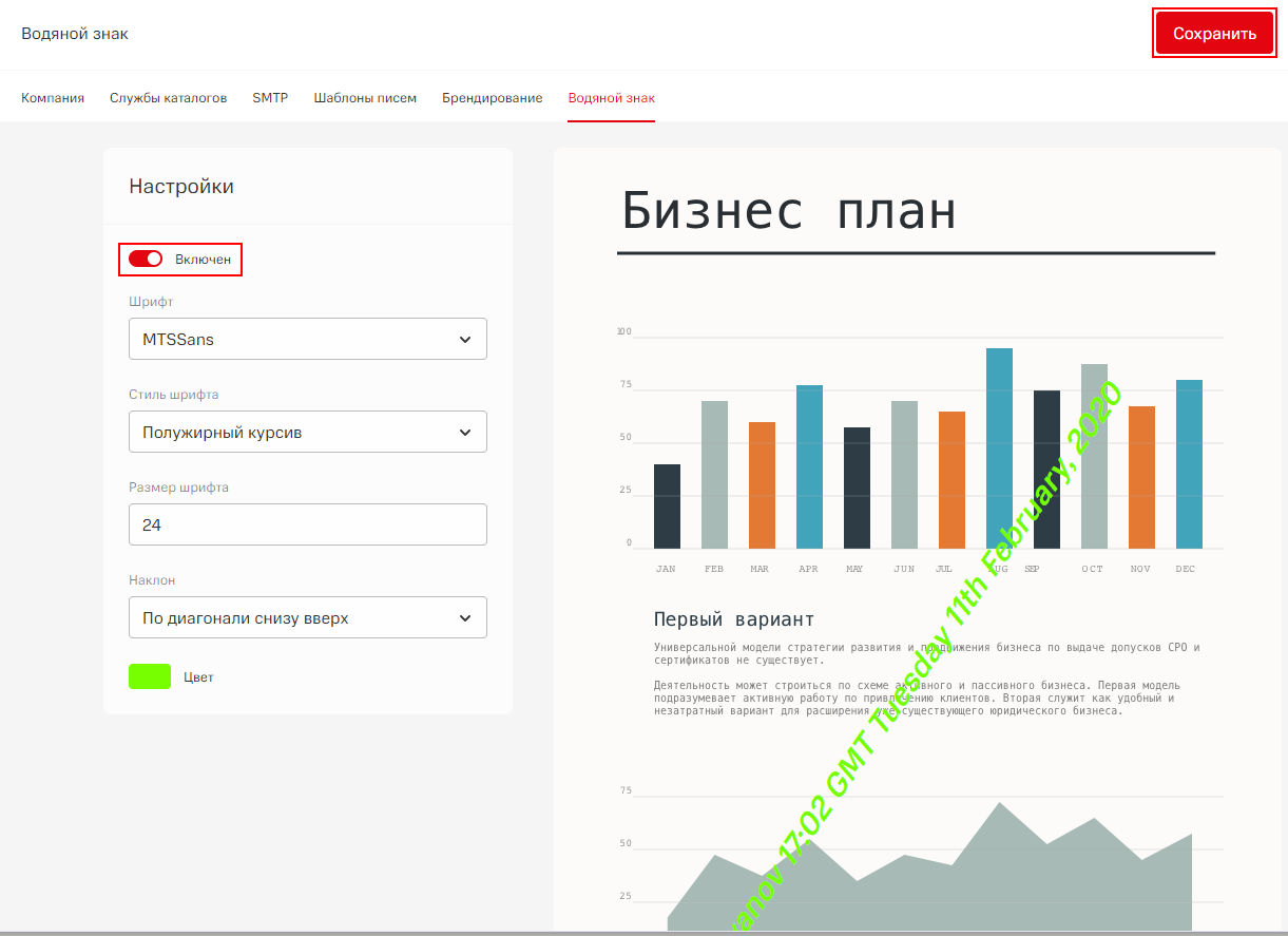 Настройки водяных знаков распространяются на все документы, отображаемые при просмотре во всех экземплярах интерфейса компании у всех пользователей.