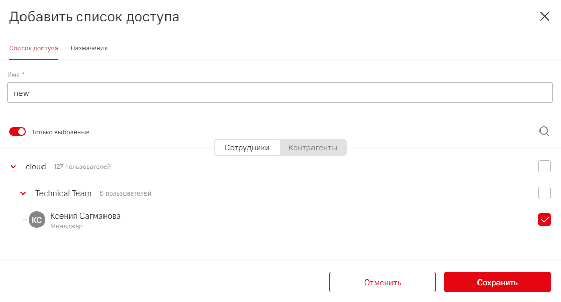 - На вкладке Список доступа выберите из списков Сотрудники и Контрагенты пользователей или подразделения, которые должны входить в этот список;