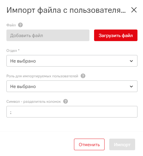 Если требуется добавить несколько пользователей в систему, возможно не создавать каждый профиль отдельно, а импортировать файл с данными пользователей в систему. При импорте пользователей возможно задать только основные настройки профилей пользователя: личные данные, роль и отдел. Задать другие данные или настроить политики, возможно после импорта.