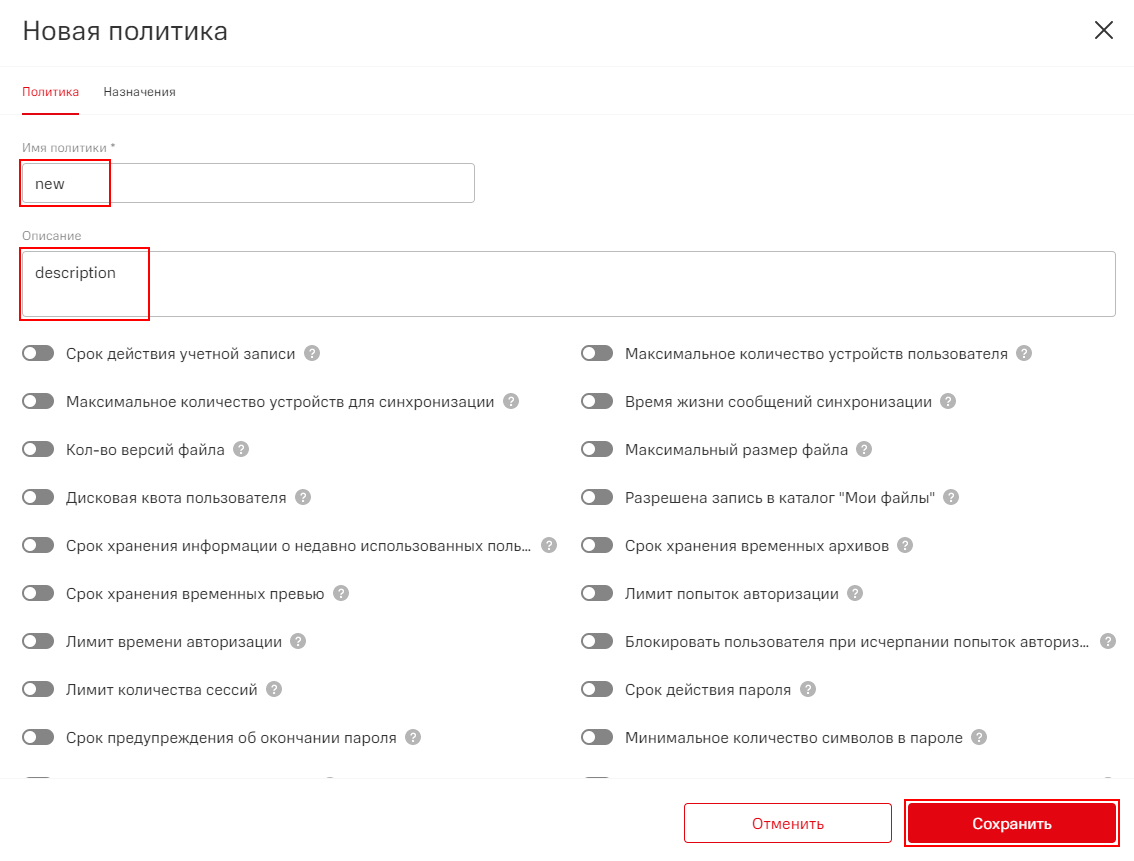 - Задайте имя новой политики. Имя политики не должно совпадать с именами уже имеющихся в системе политик и не должно быть пустым;