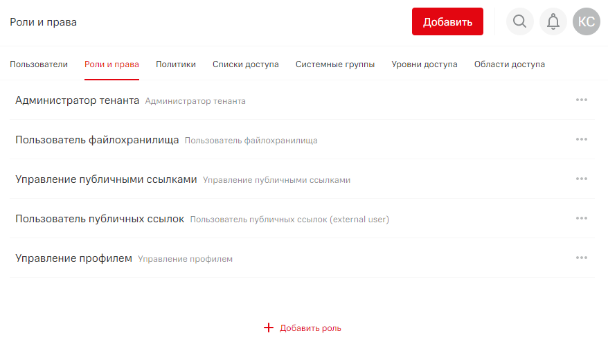 Пользователю можно назначить несколько ролей, поэтому необязательно настраивать роли так, чтобы одна роль покрывала разный функционал системы. Например, если необходимо, чтобы пользователь имел доступ и к файловому хранилищу, и к администрированию системы, возможно назначить ему две соответствующие роли, вместо настройки одной сложной роли с большим количеством функционала.