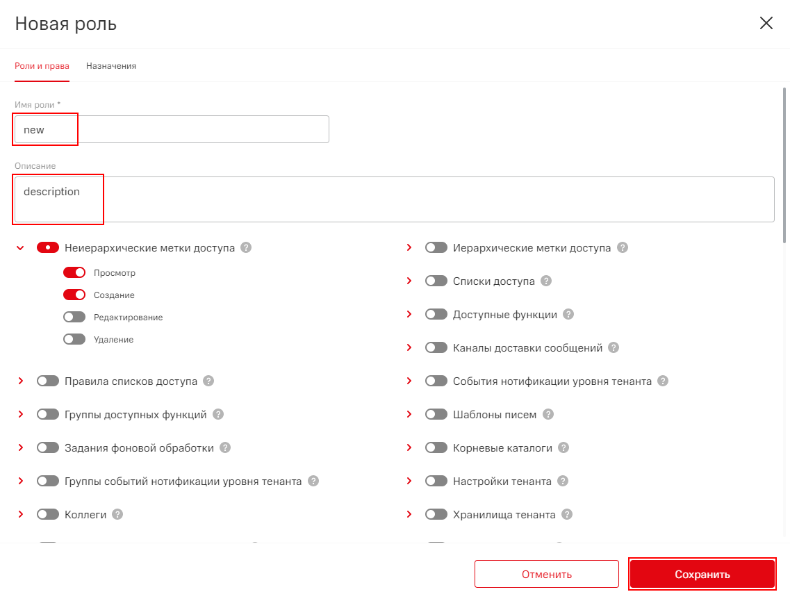 | Доступные функции | Позволяет просматривать функции роли: переключатели в настройке ролей. Чтобы пользователь мог совершать операции с переключателями в настройке ролей, необходимо активировать переключатель Роли пользователей и Функции роли |