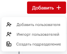 На вкладке Пользователи нажмите кнопку Добавить + и выберите команду Импорт пользователей. Кроме того, возможно импортировать пользователей напрямую в одно из существующих подразделений. Для этого наведите курсор на нужное подразделение и нажмите на соответствующую кнопку.