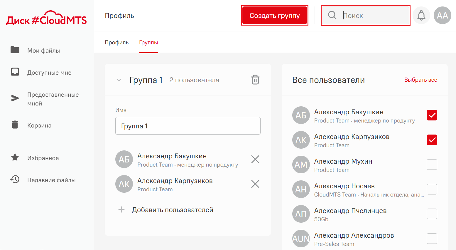 Чтобы добавить нового пользователя, нажмите на кнопку + Добавить пользователей и отметьте пользователей в списке.