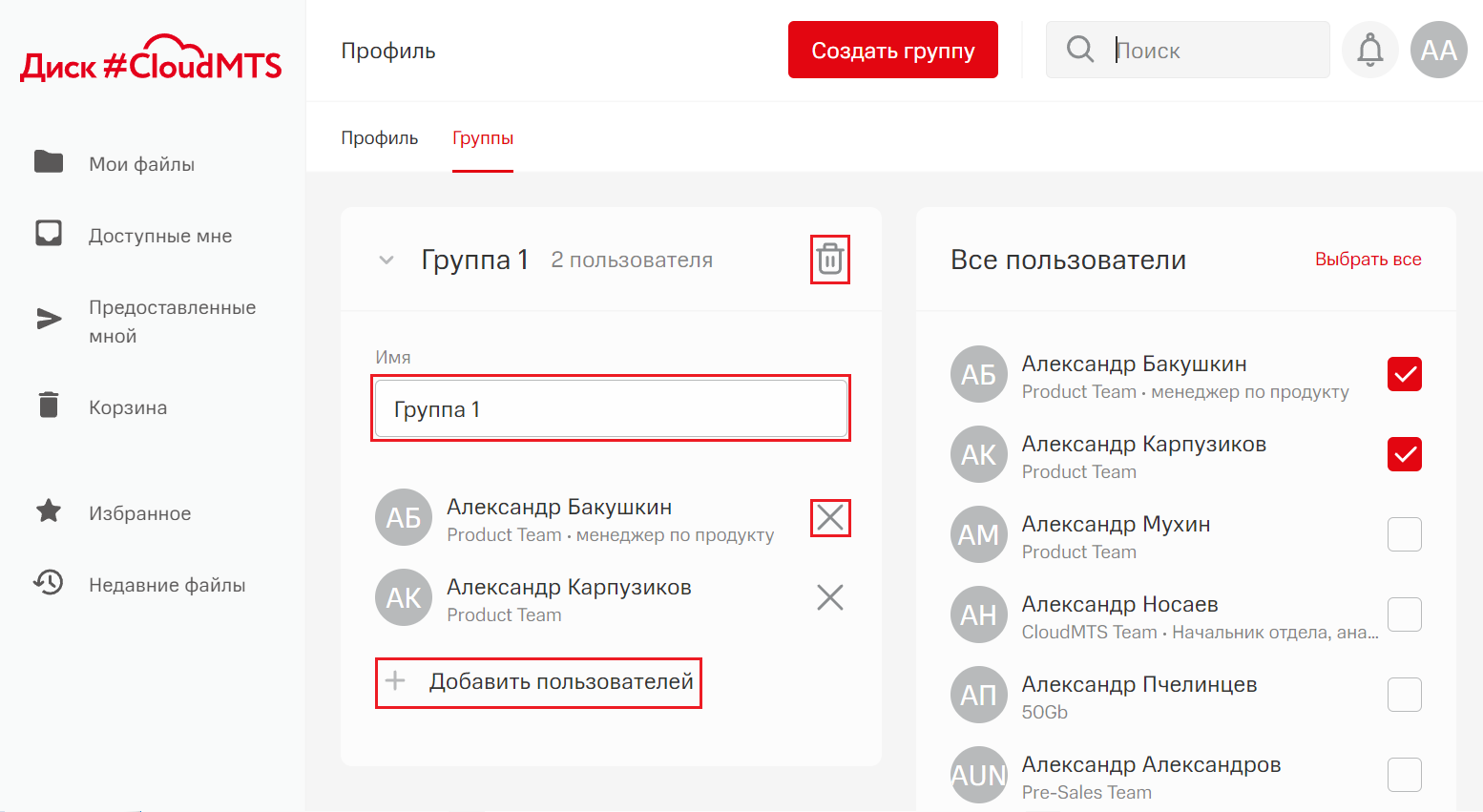 Существующую группу возможно изменить: переименовать, добавить или удалить пользователей.