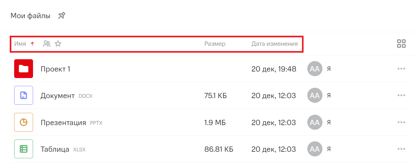 В режиме отображения списком фильтры сортировки доступны над списком файлов.