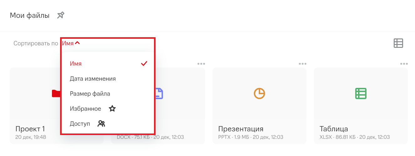 В режиме отображения иконок фильтры сортировки доступны в выпадающем списке над файлами.