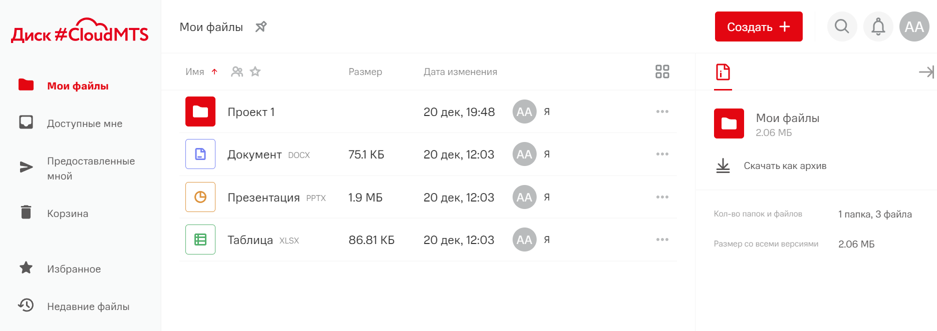 - Мои файлы − корневая папка в файловом хранилище. Объединяет все дерево каталогов;