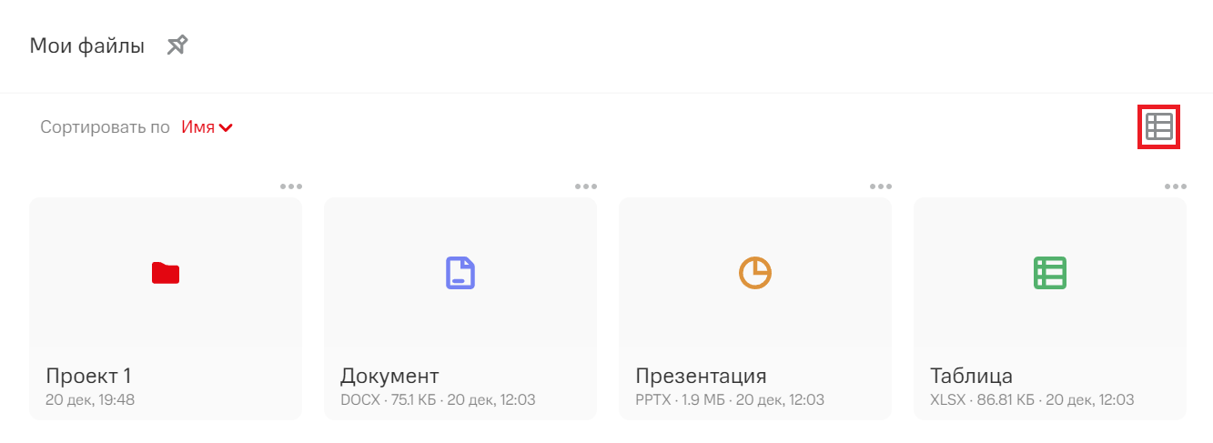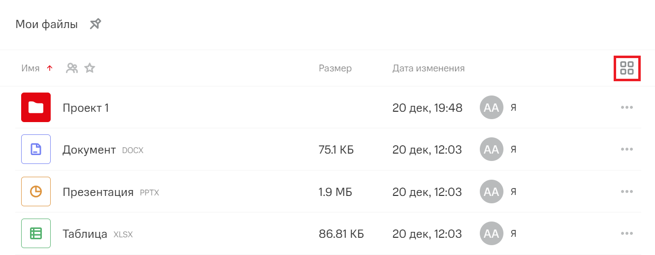 Чтобы изменить режим отображения файлов и папок, нажмите на соответствующую кнопку переключения.
